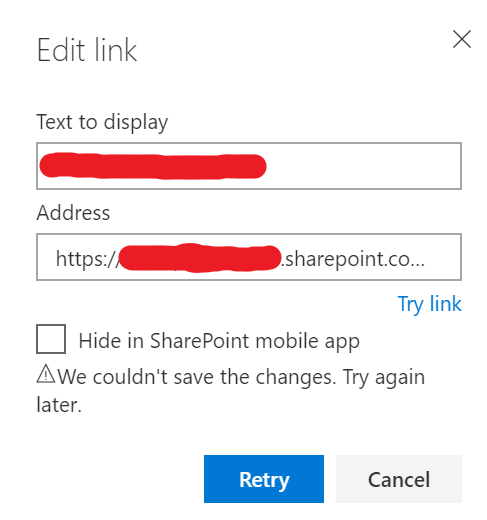 When trying to edit the Featured links on the default SharePoint home page, you may end up getting the following error. And guess what? Trying again later didn’t really work…