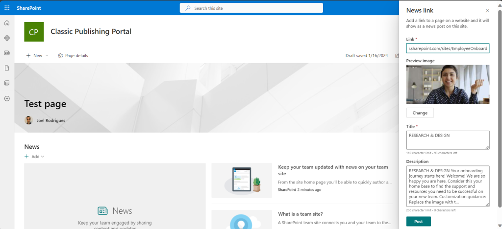 Add the News web part to the newly created page and click on the Add menu within the web part to create a News link